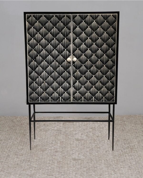 Each Arrow Bone Inlay Bar Cabinet piece has been handcrafted in a process that can take weeks using honourably sourced Bone / Mother of Pearl. Delicately carved pieces of Bone/MoP have been individually inlaid onto a wooden frame in an elaborate pattern. Layers of colored resin are then used to fill around the bone/mop. Finally, the backside and inside areas are painted with the matching colors.