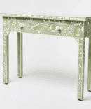 Each Bella Bone Inlay Desk has been handcrafted in a process that can take weeks using honorably sourced Bone / Mother of Pearl. Delicately carved pieces of Bone/Mother of Pearl have been individually inlaid onto a wooden frame in an elaborate pattern. Layers of colored resin are then used to fill around the bone/mop. Finally, the backside and inside areas are painted with the matching colors.