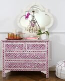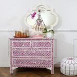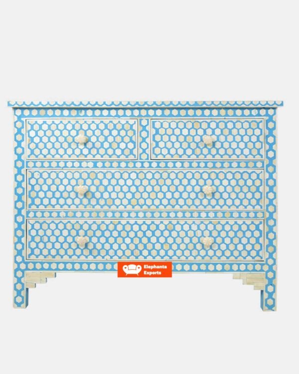 Each piece of Bone Inlay Chest of 4 Drawers Marrakech Dyed has been handcrafted in a process that can take weeks using honorably sourced Bone / Mother of Pearl. Delicately carved pieces of Bone/Mother of Pearl have been individually inlaid onto a wooden frame in an elaborate pattern. Layers of colored resin are then used to fill around the bone/mop. Finally, the backside and inside areas are painted with the matching colors.