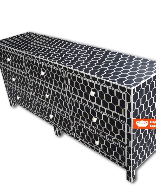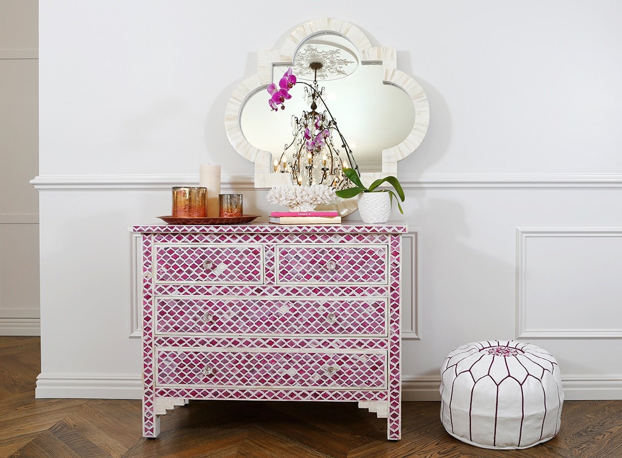 Each piece of Bone Inlay Chest of 4 Drawers Marrakech Dyed has been handcrafted in a process that can take weeks using honorably sourced Bone / Mother of Pearl. Delicately carved pieces of Bone/Mother of Pearl have been individually inlaid onto a wooden frame in an elaborate pattern. Layers of colored resin are then used to fill around the bone/mop. Finally, the backside and inside areas are painted with the matching colors.
