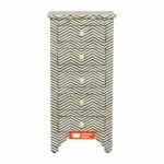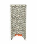 Bone Inlay Tall Boy Chest Chevron Black brings luxurious elegance and artisanal craftsmanship to your bedroom. Its striking chevron pattern, bold black finish, and spacious drawers create both a functional and visually captivating centerpiece.
