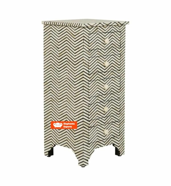 Each piece of Bone Inlay Tall Boy Chest Chevron Black has been handcrafted in a process that can take weeks using honorably sourced Bone / Mother of Pearl. Delicately carved pieces of bone/MOP have been individually inlaid onto a wooden frame in an elaborate pattern. Layers of colored resin are then used to fill around the bone/mop. Finally, the Bone Inlay Tall Boy Chest Chevron backside and inside areas are painted with the matching colors.