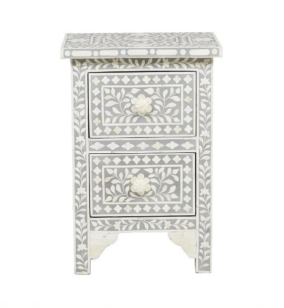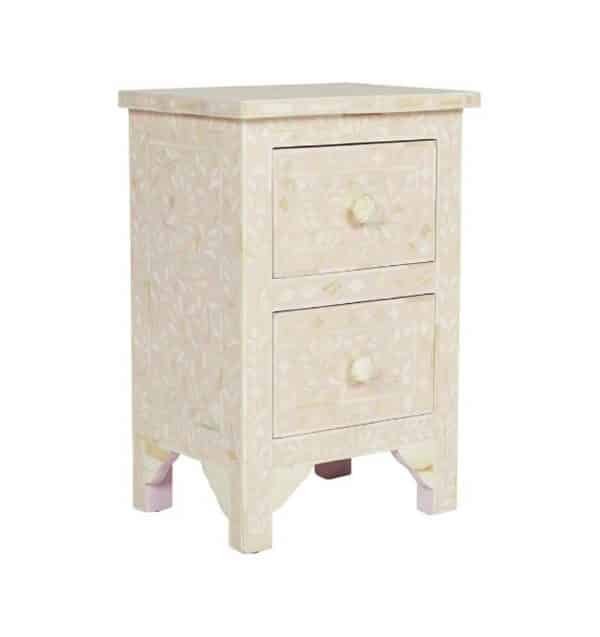 Variations in the natural product color, pattern, and shade are inherent and unique characteristics to be expected with Floral 2 Drawer Bone Inlay Bedside. No two tables are ever exactly alike, with thousands of intricate pieces hand-laid to complete this delightful masterpiece. Each product is unique and may have different variations with anomalies due to handmade in nature.