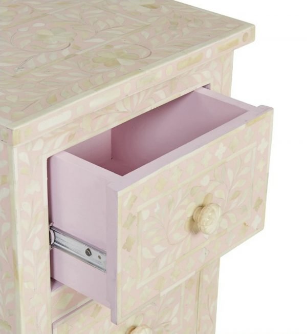 Each Floral 2 Drawer Bone Inlay Bedside piece has been handcrafted in a process that can take weeks using honorably sourced Bone / Mother of Pearl. Delicately carved pieces of Bone/MoP have been individually inlaid onto a wooden frame in an elaborate pattern. Layers of colored resin are then used to fill around the bone/mop. Finally, the backside and inside areas are painted with the matching colors.