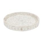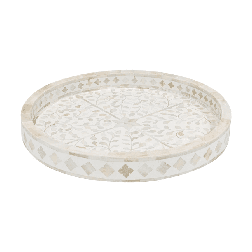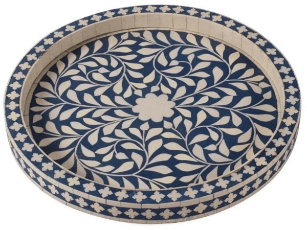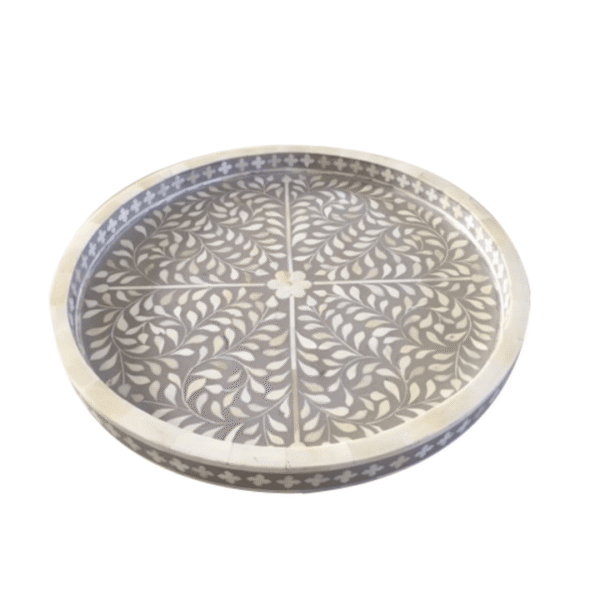 Variations in the natural product color, pattern, and shade are inherent and unique characteristics to be expected with Floral Bone Inlay Round Tray. No two Bone Inlay Tray are ever exactly alike, with thousands of intricate pieces hand-laid to complete this delightful masterpiece. Each product is unique and may have different variations with anomalies due to handmade in nature.