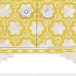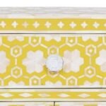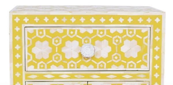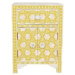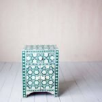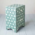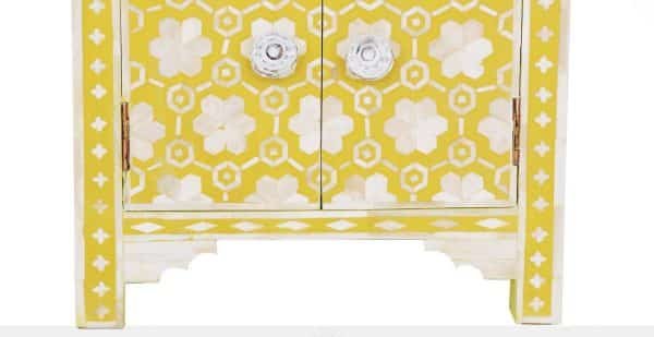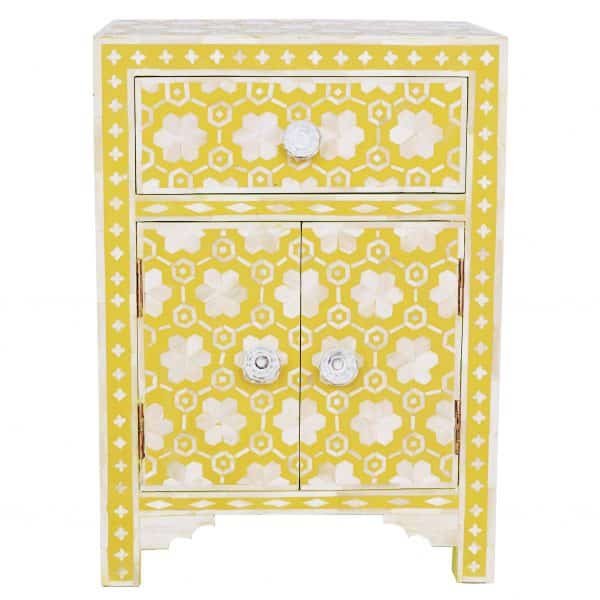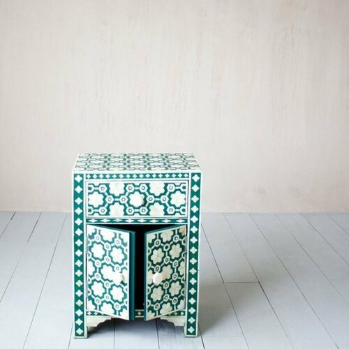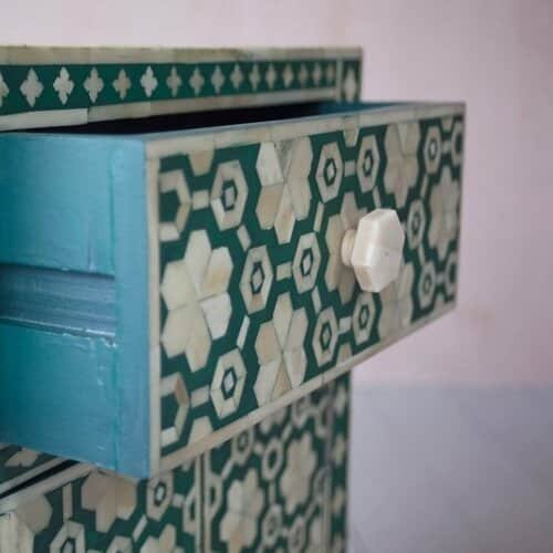 Each piece has been handcrafted in a process that can take weeks using honorably sourced Bone / Mother of Pearl. Delicately carved pieces of Bone/MoP have been individually inlaid onto a wooden frame in an elaborate pattern. Layers of colored resin are then used to fill around the bone/mop. Finally, the Gajra Bone Inlay Nightstand backside and inside areas are painted with the matching colors.