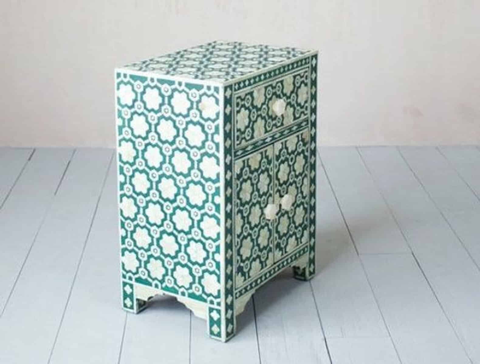 Each piece has been handcrafted in a process that can take weeks using honorably sourced Bone / Mother of Pearl. Delicately carved pieces of Bone/MoP have been individually inlaid onto a wooden frame in an elaborate pattern. Layers of colored resin are then used to fill around the bone/mop. Finally, the Gajra Bone Inlay Nightstand backside and inside areas are painted with the matching colors.