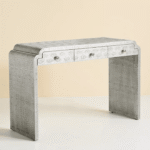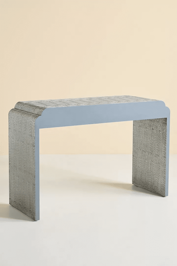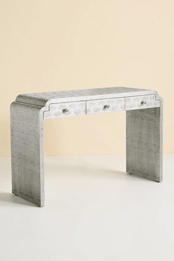 Variations in the natural product color, pattern, and shade are inherent and unique characteristics to be expected with this German Silver Embossed Console. No two tables are ever exactly alike, with thousands of intricate pieces hand-laid to complete this delightful masterpiece. Each product is unique and may have different variations with anomalies due to handmade in nature.