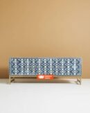 Variations in the natural product color, pattern, and shade are inherent and unique characteristics to be expected with Ikat Bone Inlay Media Console in Blue. No two tables are ever exactly alike, with thousands of intricate pieces hand-laid to complete this delightful masterpiece. Each product is unique and may have different variations with anomalies due to handmade in nature.