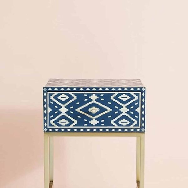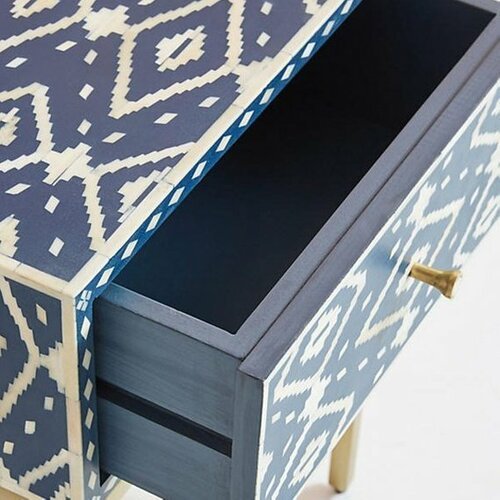 Variations in the natural product color, pattern, and shade are inherent and unique characteristics to be expected with this product. No two tables are ever exactly alike, with thousands of intricate pieces hand-laid to complete this delightful masterpiece. Each Ikat Bone Inlay Nightstand product is unique and may have different variations with anomalies due to handmade in nature.
