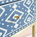 Each Ikat Bone Inlay Nightstand has been handcrafted in a process that can take weeks using honorably sourced Bone / Mother of Pearl. Delicately carved pieces of Bone/MoP have been individually inlaid onto a wooden frame in an elaborate pattern. Layers of colored resin are then used to fill around the bone/mop. Finally, the backside and inside areas are painted with the matching colors.