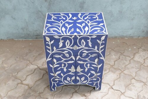 Each Laila Bedside Pearl Inlay piece has been handcrafted in a process that can take weeks using honorably sourced Bone / Mother of Pearl. Delicately carved pieces of Bone/MoP have been individually inlaid onto a wooden frame in an elaborate pattern. Layers of colored resin are then used to fill around the bone/mop. Finally, the backside and inside areas are painted with the matching colors.