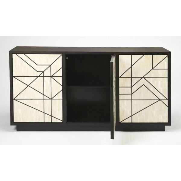Each Manhattan Bone Inlay Sideboard piece has been handcrafted in a process that can take weeks using honorably sourced Bone / Mother of Pearl. Delicately carved pieces of Bone/MoP have been individually inlaid onto a wooden frame in an elaborate pattern. Layers of colored resin are then used to fill around the bone/mop. Finally, the backside and inside areas are painted with the matching colors.