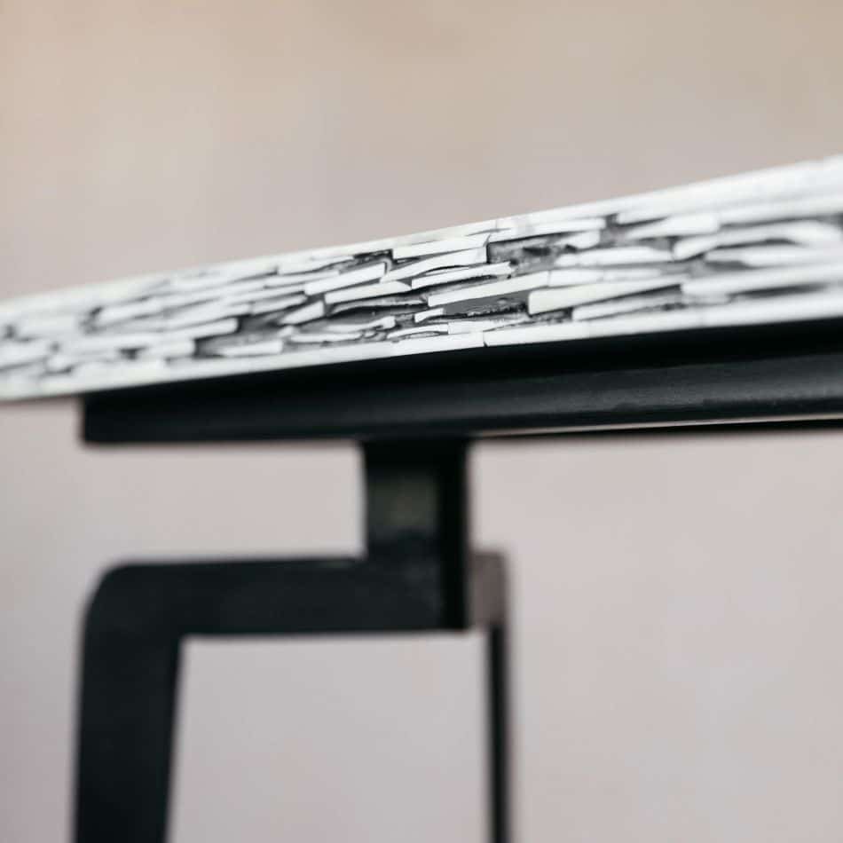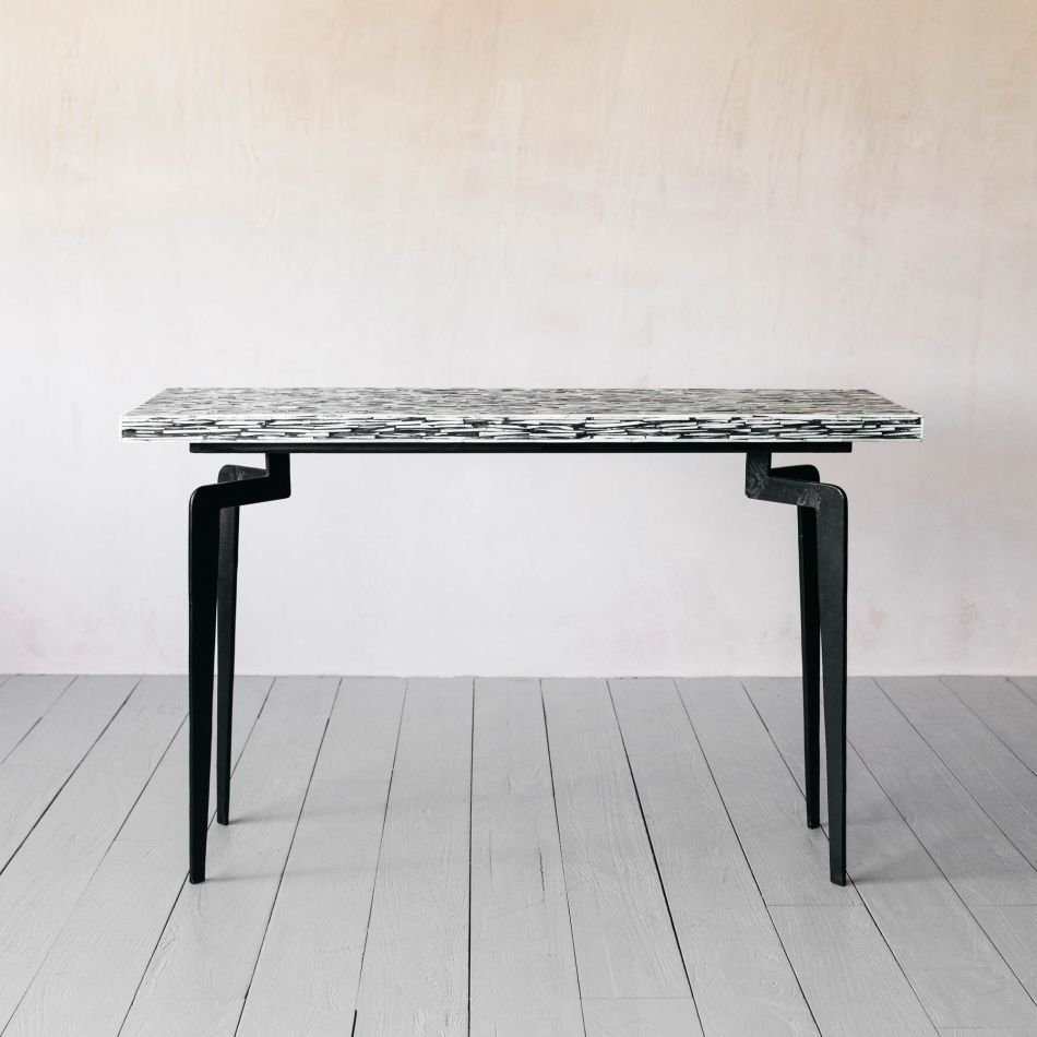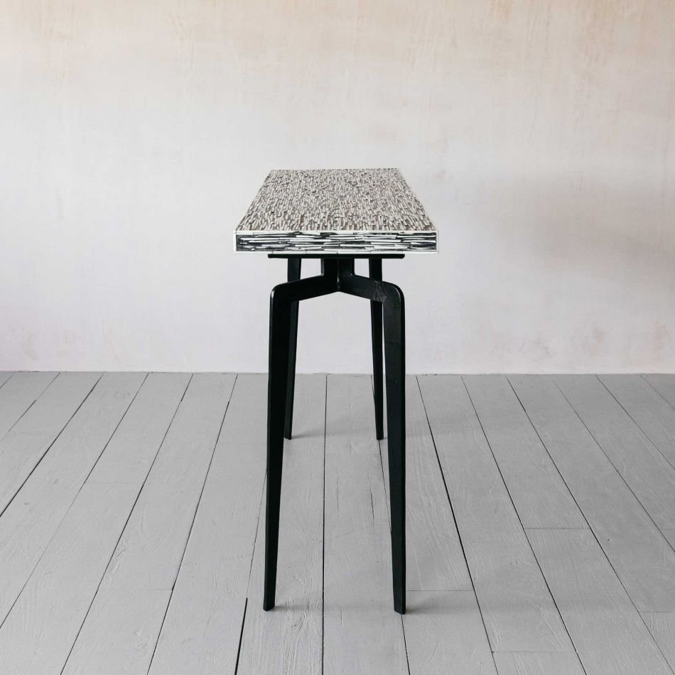 Variations in the natural product color, pattern, and shade are inherent and unique characteristics to be expected with Modern Bone Inlay Console Black. No two tables are ever exactly alike, with thousands of intricate pieces hand-laid to complete this delightful masterpiece. Each product is unique and may have different variations with anomalies due to handmade in nature.