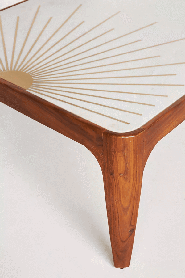 This Nimbus Rectangular Coffee Table is a stunning centerpiece for your living space. The intricate brass lined starburst design on white marble top adds a touch of elegance and gives a luxurious and timeless appeal. It effortlessly combines style and sophistication in one captivating piece.