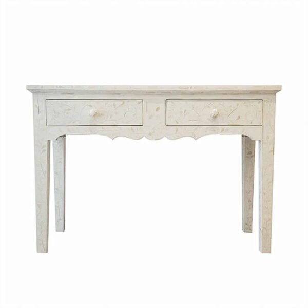 Each piece of Provincial Bone Inlay Console has been handcrafted in a process that can take weeks using honorably sourced Bone / Mother of Pearl. Delicately carved pieces of Bone/Mother of Pearl have been individually inlaid onto a wooden frame in an elaborate pattern. Layers of colored resin are then used to fill around the bone/mop. Finally, the backside and inside areas are painted with the matching colors.