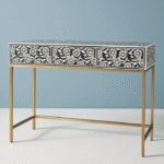 The Raavi Bone Inlay Desk radiates handcrafted artistry, featuring intricate detailing and a warm, luxurious presence. A statement centerpiece for sophisticated spaces.