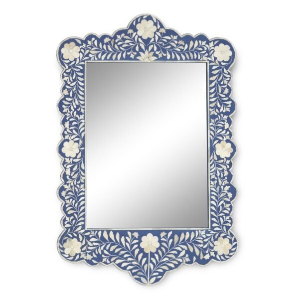 Each piece of Scalloped Bone Inlay Mirror Floral has been handcrafted in a process that can take weeks using honorably sourced Bone / Mother of Pearl. Delicately carved pieces of Bone/Mother of Pearl have been individually inlaid onto a wooden frame in an elaborate pattern. Layers of colored resin are then used to fill around the bone/mop. Finally, the backside and inside areas are painted with the matching colors.