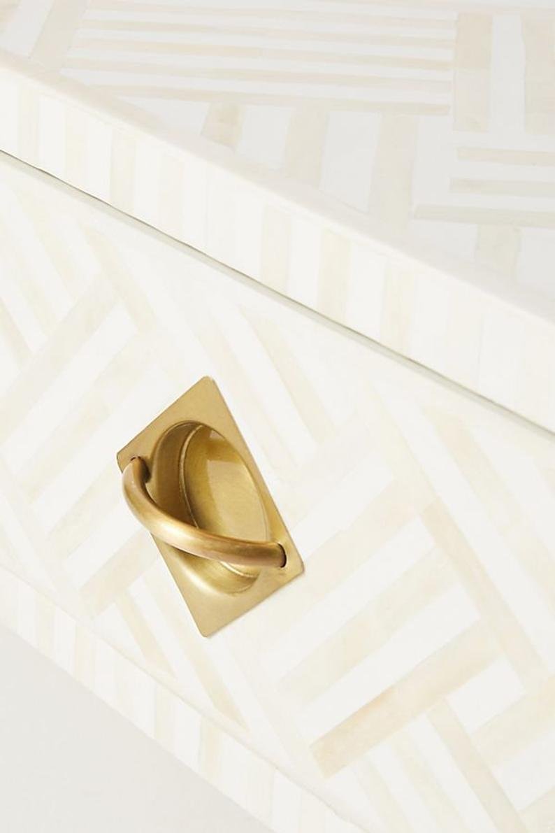 Each piece of Striped Bone Inlay Coffee Table with 2 Drawers has been handcrafted in a process that can take weeks using honorably sourced Bone / Mother of Pearl. Delicately carved pieces of Bone/Mother of Pearl have been individually inlaid onto a wooden frame in an elaborate pattern. Layers of colored resin are then used to fill around the bone/mop. Finally, the backside and inside areas are painted with the matching colors.