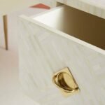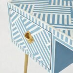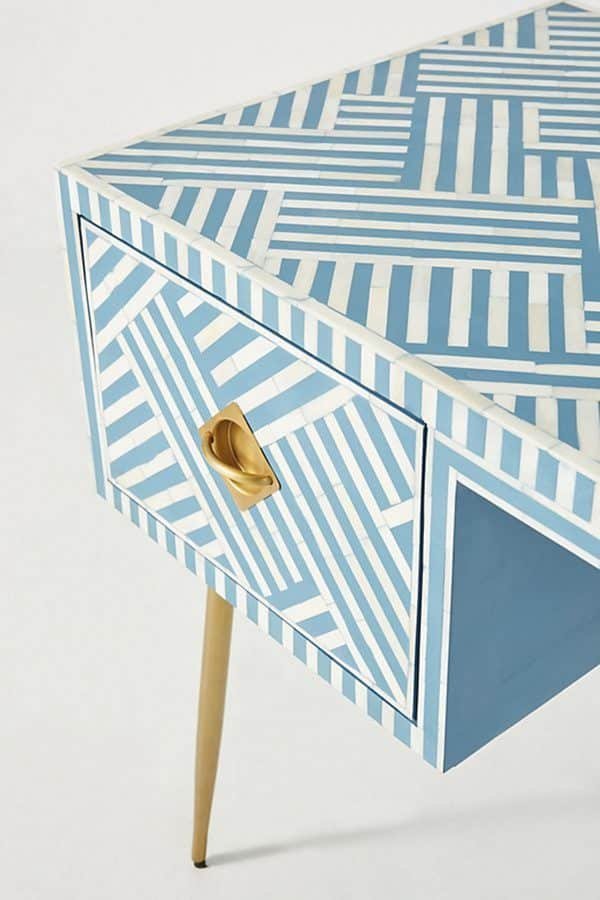 Each piece has been handcrafted in a process that can take weeks using honorably sourced Bone / Mother of Pearl. Delicately carved pieces of Bone/Mother of Pearl have been individually inlaid onto a wooden frame in an elaborate pattern. Layers of colored resin are then used to fill around the bone/mop. Finally, the Striped Bone Inlay Console / Desk backside and inside areas are painted with the matching colors.