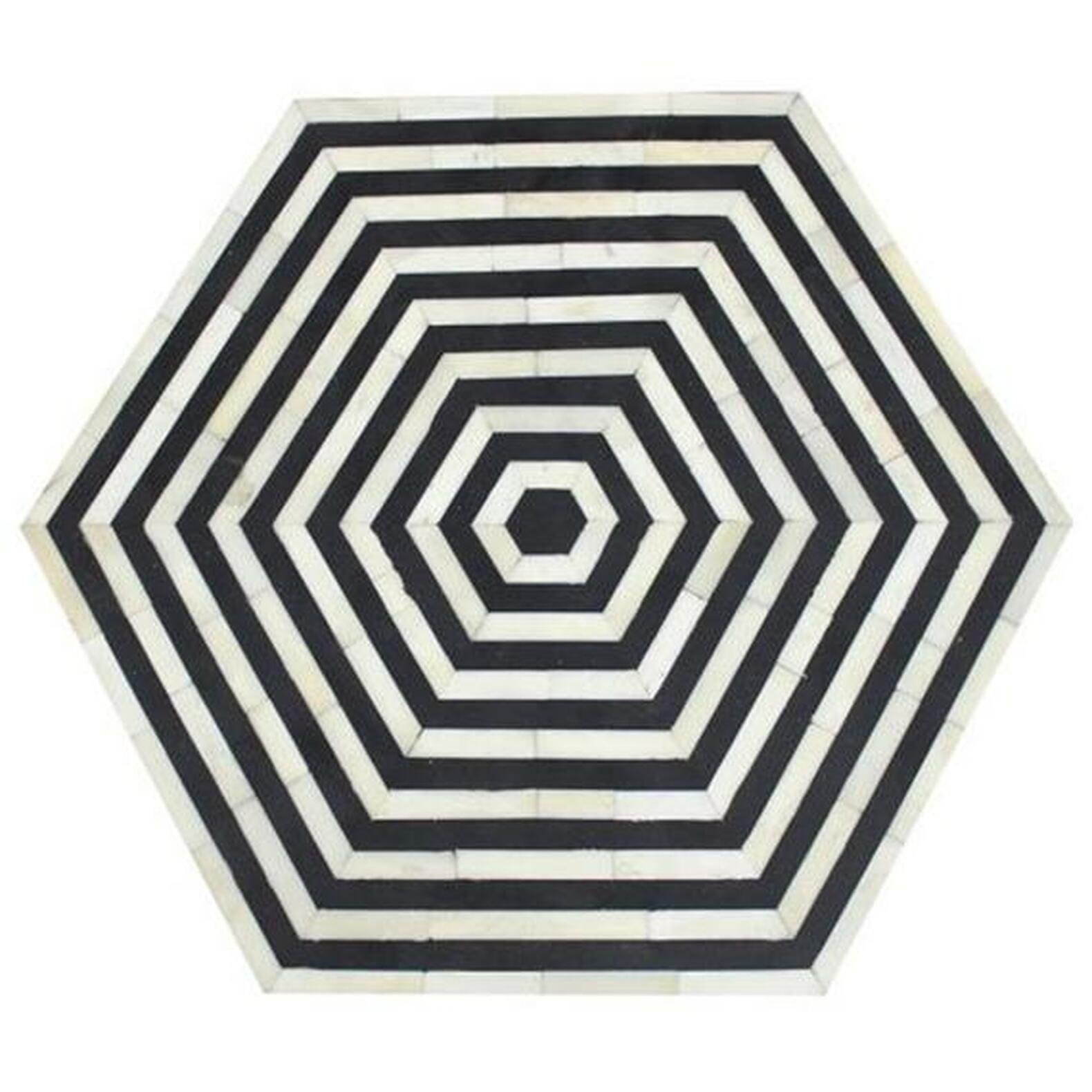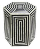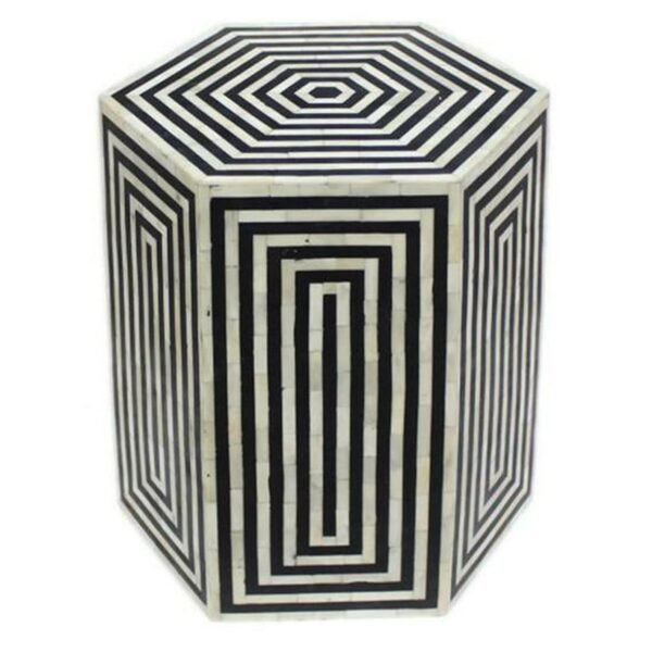 Variations in the natural product color, pattern, and shade are inherent and unique characteristics to be expected with Striped Hexagonal Bone Inlay Black Side table. No two tables are ever exactly alike, with thousands of intricate pieces hand-laid to complete this delightful masterpiece. Each product is unique and may have different variations with anomalies due to handmade in nature.