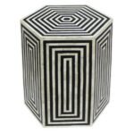 Each piece has been handcrafted in a process that can take weeks using honorably sourced Bone / Mother of Pearl. Delicately carved pieces of Bone/Mother of Pearl have been individually inlaid onto a wooden frame in an elaborate pattern. Layers of colored resin are then used to fill around the bone/mop. Finally, the Striped Hexagonal Bone Inlay Black Side table backside and inside areas are painted with the matching colors.