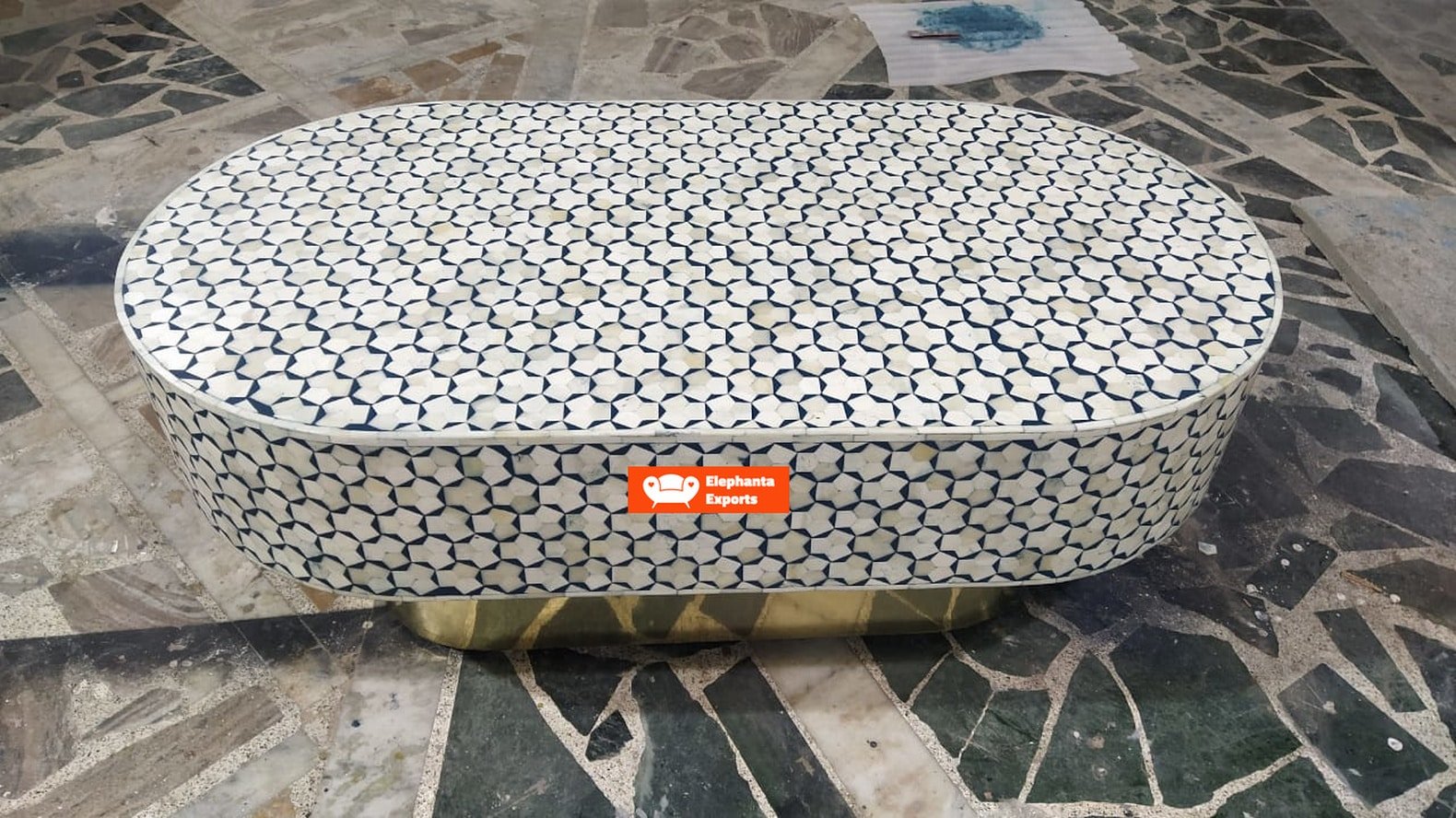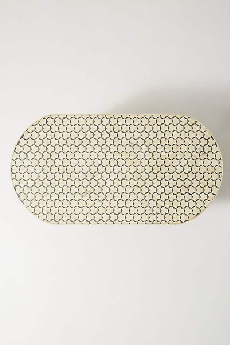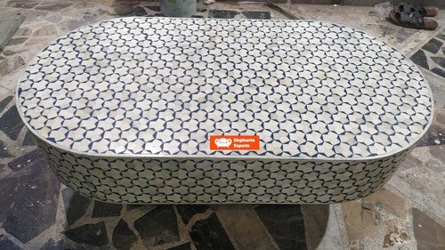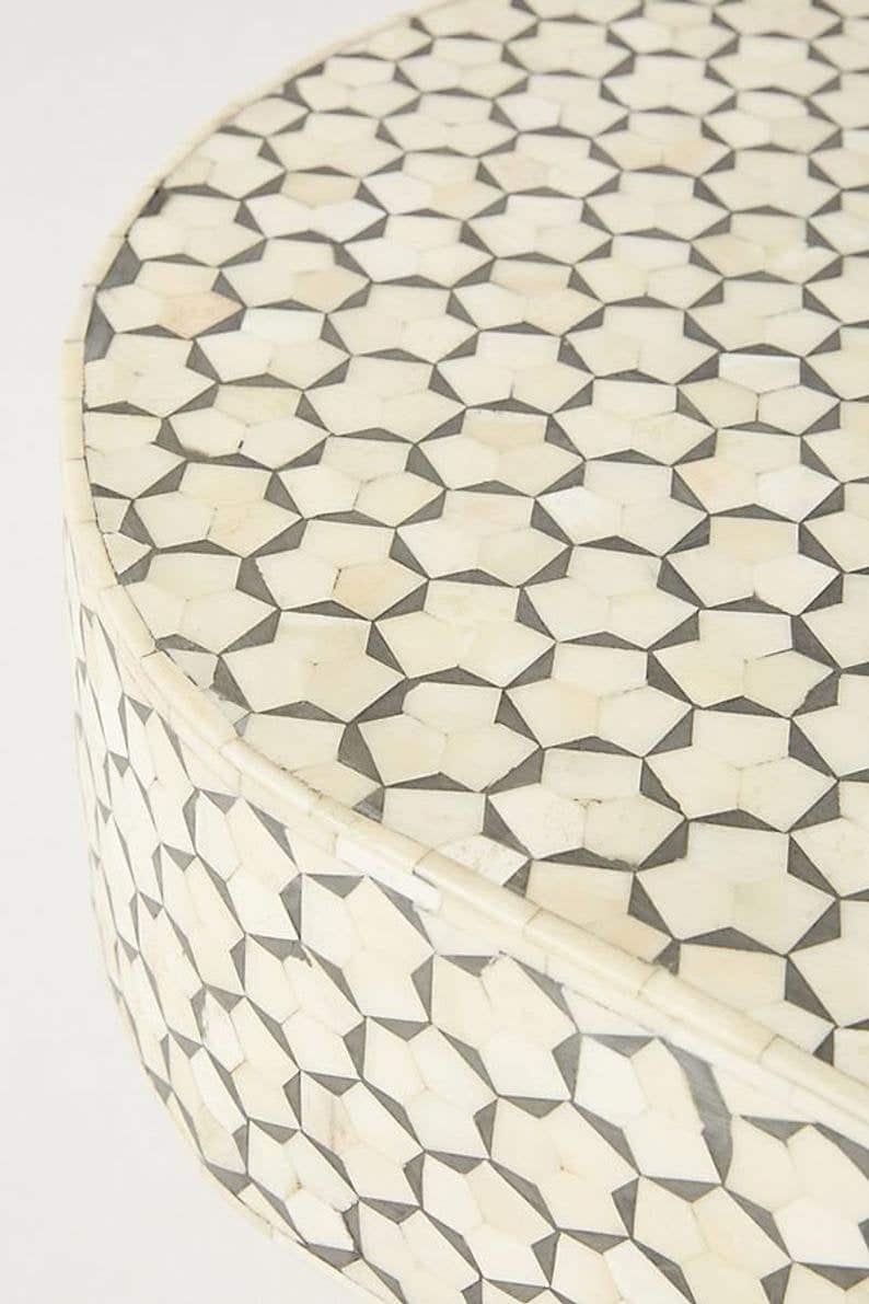 Variations in the natural product color, pattern, and shade are inherent and unique characteristics to be expected with Targua Bone Inlay Coffee Table Oval product. No two tables are ever exactly alike, with thousands of intricate pieces hand-laid to complete this delightful masterpiece. Each product is unique and may have different variations with anomalies due to handmade in nature.
