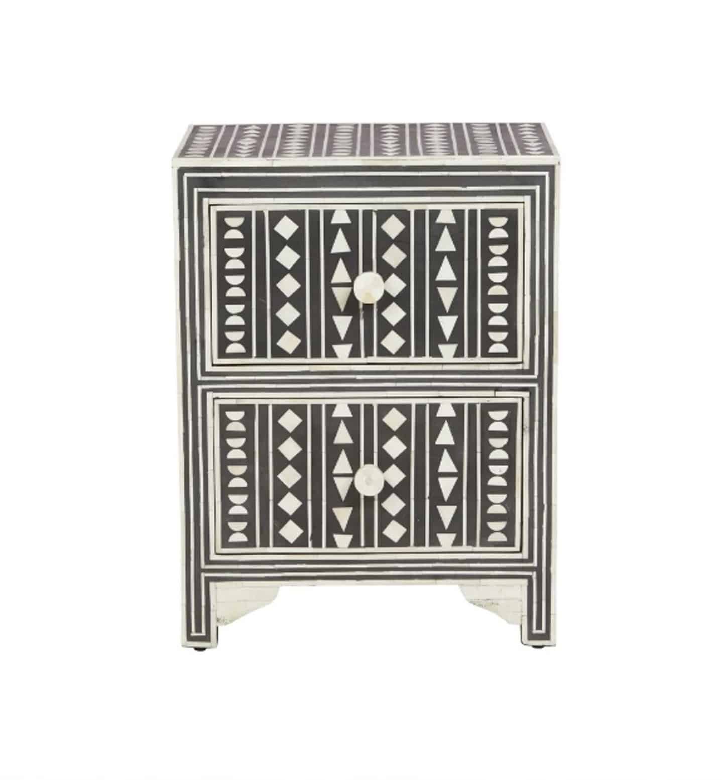 Variations in the natural product color, pattern, and shade are inherent and unique characteristics to be expected with this Tribal Amayra Bone Inlay Nightstand. No two tables are ever exactly alike, with thousands of intricate pieces hand-laid to complete this delightful masterpiece. Each product is unique and may have different variations with anomalies due to handmade in nature.