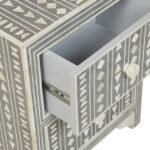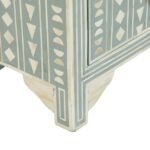 Each Tribal Amayra Bone Inlay Nightstand piece has been handcrafted in a process that can take weeks using honorably sourced Bone / Mother of Pearl. Delicately carved pieces of Bone/MoP have been individually inlaid onto a wooden frame in an elaborate pattern. Layers of colored resin are then used to fill around the bone/mop. Finally, the backside and inside areas are painted with the matching colors.