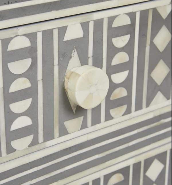 Each Tribal Bone Inlay Bedside piece has been handcrafted in a process that can take weeks using honorably sourced Bone / Mother of Pearl. Delicately carved pieces of Bone/MoP have been individually inlaid onto a wooden frame in an elaborate pattern. Layers of colored resin are then used to fill around the bone/mop. Finally, the backside and inside areas are painted with the matching colors.